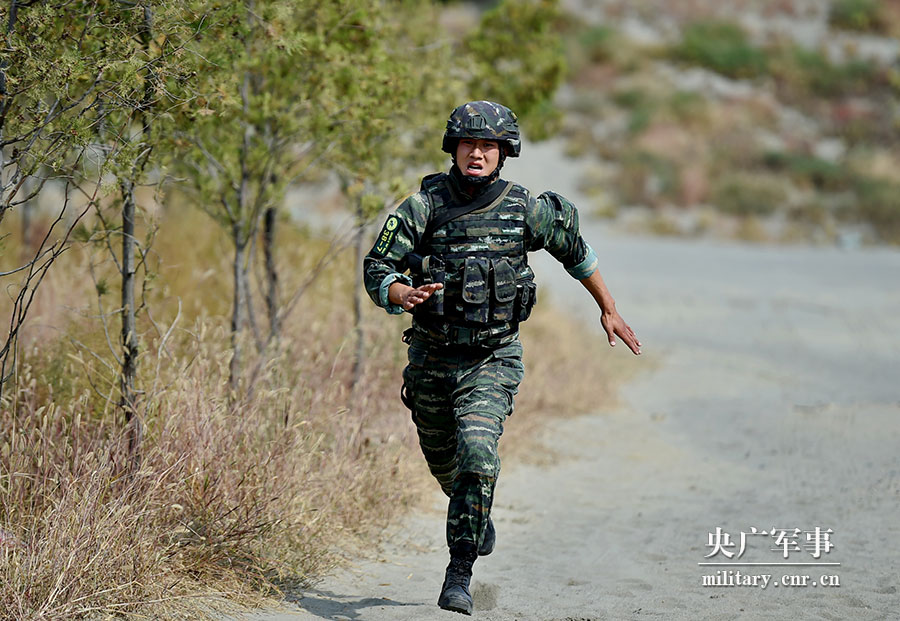 9月25日,在搜索识别射击课目比武中,一名参赛队员按指定路线快速奔跑300米至搜索射击出发地线。曹峰摄