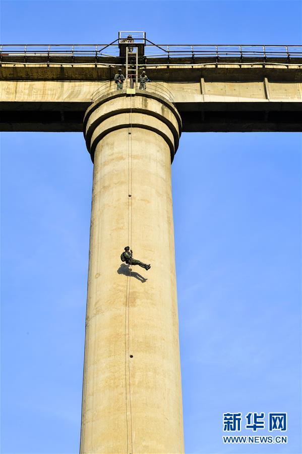 在小队战术课目中,一名参赛队员进行索降(9月25日摄)。新华社发(李涛摄)