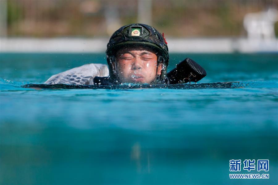 在个人全能课目中,一名参赛队员进行武装泅渡(9月26日摄)。新华社发(王涛摄)