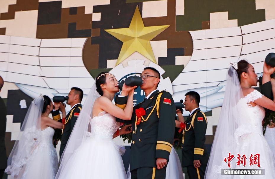 9月27日上午,陆军第78集团军某旅因执行任务推迟婚期的新人48对喜结连理,他们在战友们的祝福声中,共同迈进婚姻殿堂。图为新人喝交杯酒。中新社发 江耀 摄