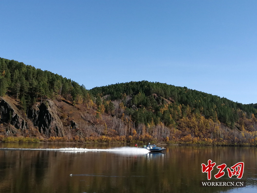↑边防战士在黑龙江江面上乘艇巡逻。
