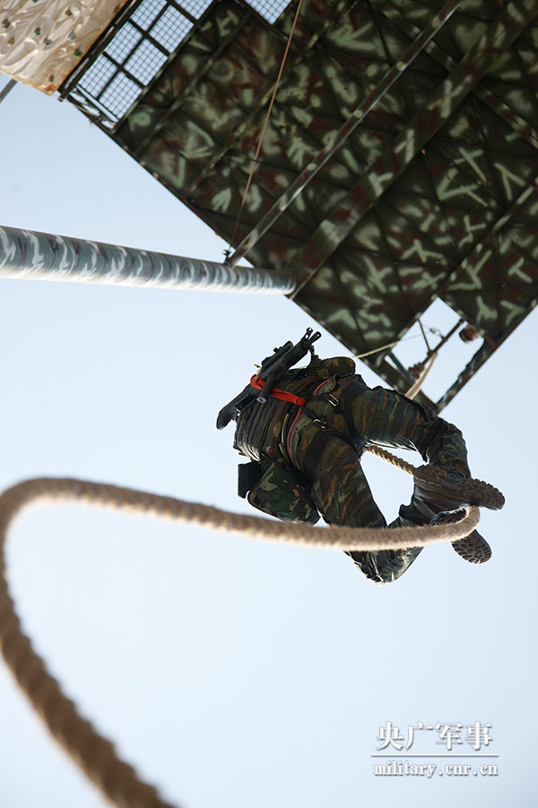 9月26日,在个人全能课目中,参赛队员利用大绳攀爬至楼顶进行射击。曹峰摄