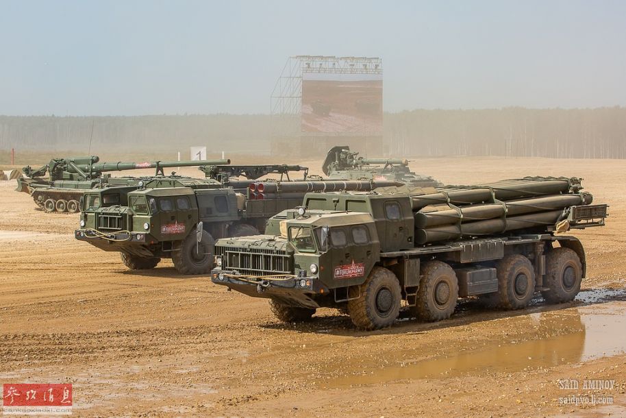 参加地面机动展示的俄军S-300远火、装填车和2S7自行火炮。