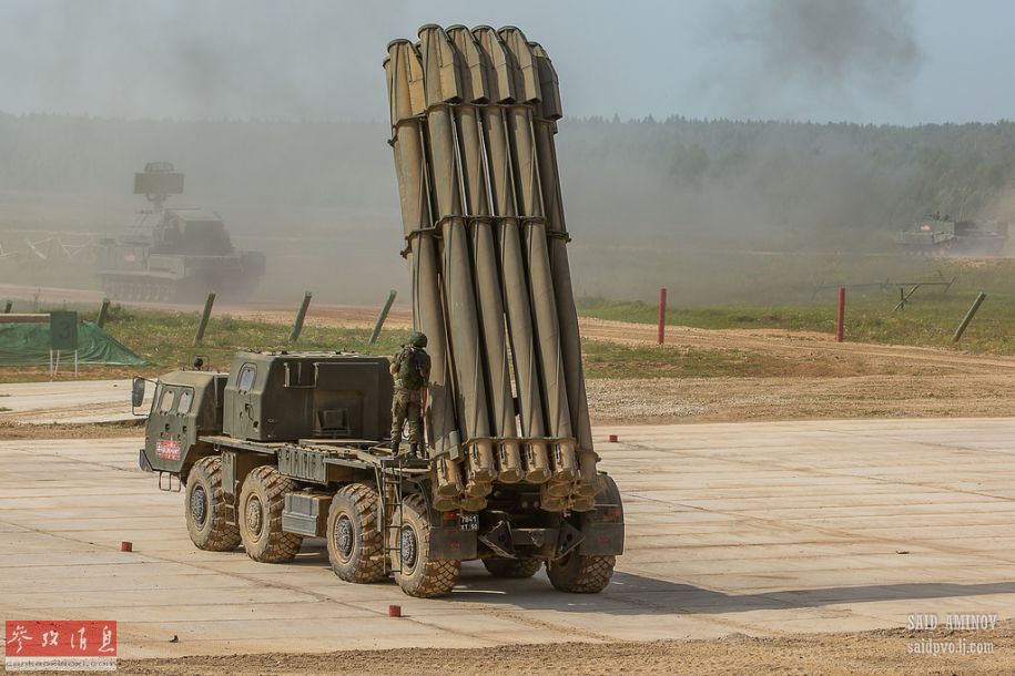 “龙卷风”远火高仰角起竖发射器,远处背景可见一辆“道尔”自行防空导弹系统。