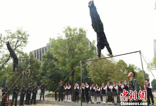 武警合肥支队特战中队特战队员在向少先队员们演示军事动作。 徐明摄