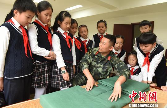 武警合肥支队十九中队班长高光田在向少先队员演示叠军被。 徐明摄