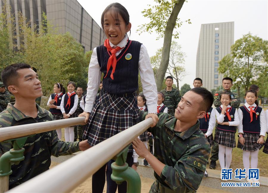 10月9日,少先队员们在武警安徽总队合肥支队体验官兵训练。