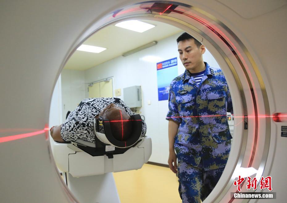 当地时间10月9日,在格林纳达首都圣乔治,执行“和谐使命-2018”任务的中国海军和平方舟医院船圆满结束对格林纳达的友好访问。访格期间,和平方舟先后派出11支医疗分队,前往当地医院、社区、青年体育中心等开展诊疗,累计完成诊疗7275人次。资料图为中方医生为格民众进行CT检查。中新社发 中国海军和平方舟医院船供图
