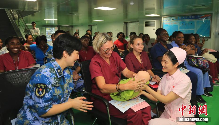 当地时间10月9日,在格林纳达首都圣乔治,执行“和谐使命-2018”任务的中国海军和平方舟医院船圆满结束对格林纳达的友好访问。访格期间,和平方舟医护专家与格方40名护理人员开展护理技术展示交流,现场操作演示“骨髓腔穿刺”“新生儿抚触”等技能。资料图为格林纳达圣乔治大学护理学院主席索罗蒙女士(前左二)体验“新生儿抚触”技术。中新社发 中国海军和平方舟医院船供图