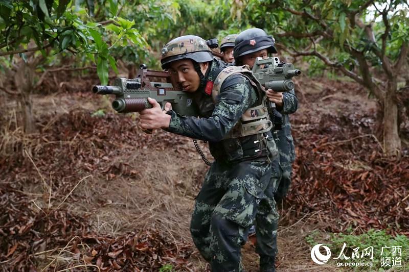 人民网南宁10月10日电 近日,武警广西总队南宁支队将特战分队拉至桂西某地开展“魔鬼周”极限训练。