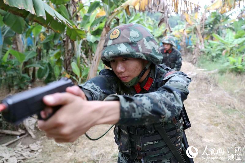 武警南宁支队特战队员正在对芭蕉林地进行搜索