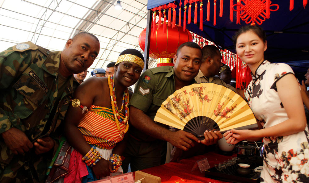 身着传统服饰的维和官兵与外军维和官兵合影(杨双权摄)