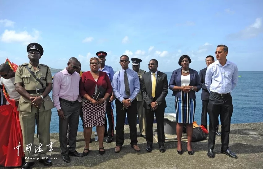 中国海军和平方舟医院船缓缓驶离格林纳达圣乔治港时,格卫生部长斯蒂尔(右一)率政府官员前来送行。