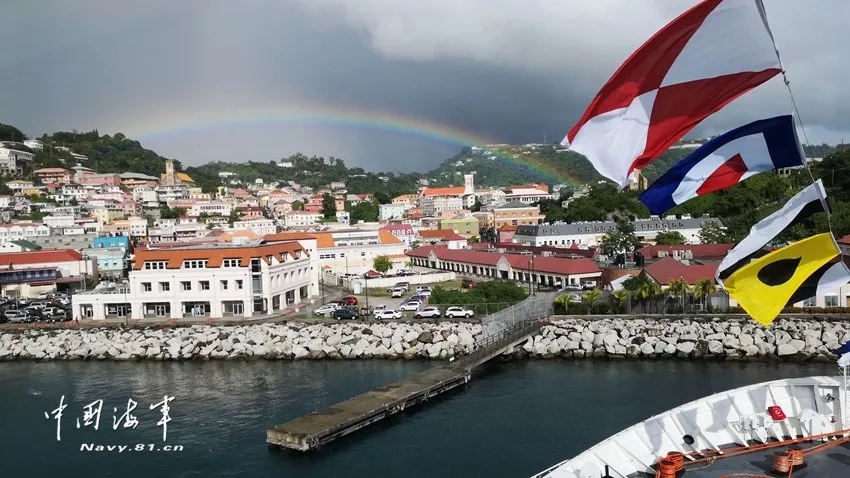 一道彩虹将格首都圣乔治与和平方舟相连,构成了一幅美景。