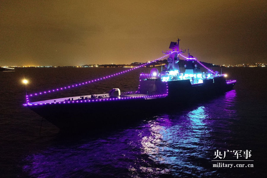 10月15日夜晚,位突尼斯湾锚地抛锚的芜湖舰悬挂满灯。张海龙摄