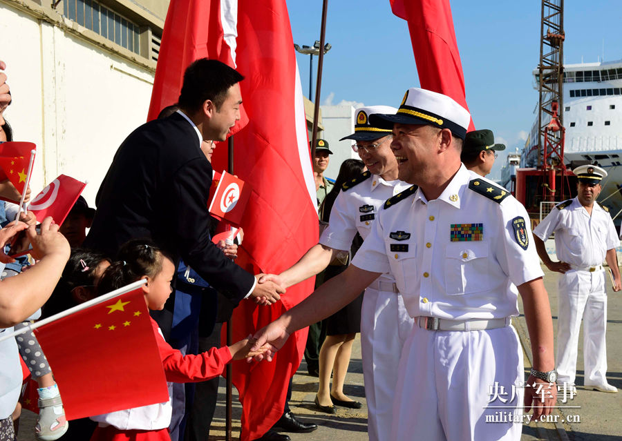 10月14日,芜湖舰抵达突尼斯拉古莱特港,第三十批护航编队领导与前来迎接的当地华人华侨握手。来永雷摄
