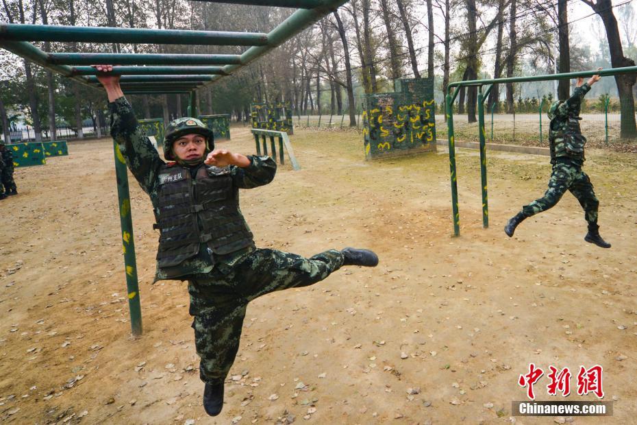 参训武警官兵快速通过云梯障碍。袁浩翔 摄