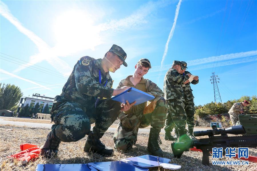 10月18日,射击完毕后,裁判员向参赛队员确认成绩。 “锋刃-2018”国际狙击手射击竞赛18日在燕山深处武警某训练基地开幕,来自中国、白俄罗斯、中非、匈牙利、以色列、巴基斯坦等21个国家的100余名狙击精英展开同场竞技。 新华社发(安晓惠 摄)