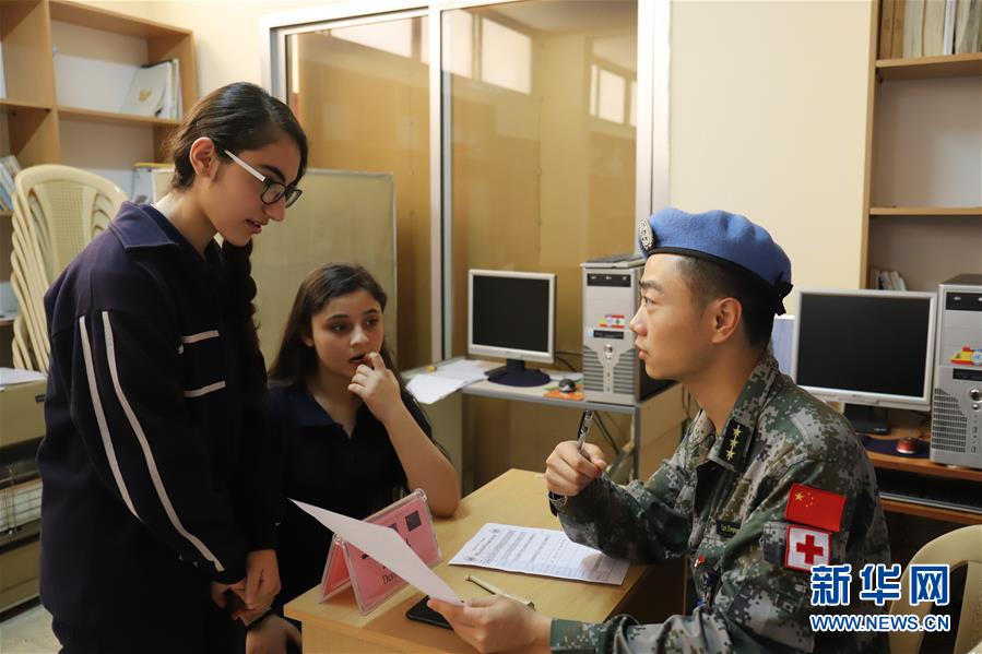 10月18日,在黎巴嫩南部马家永镇的一所学校,中国维和医院皮肤科医生王兴旺为学生讲解皮肤健康知识。17日和18日两天,中国第17批赴黎巴嫩维和医疗分队连续两天派出15名医务人员前往驻地附近的一所教会学校,开展义诊慰问活动。 新华社发(蒙卓霖 摄)