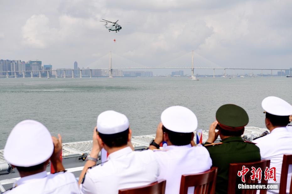 10月23日,中国—东盟“海上联演—2018”观摩团一行在湛江某军港登上中国海军戚继光舰,参观了舰载模拟器训练,并观摩营救落水人员训练。图为观摩团观摩营救落水人员训练。中新社记者 陈文 摄