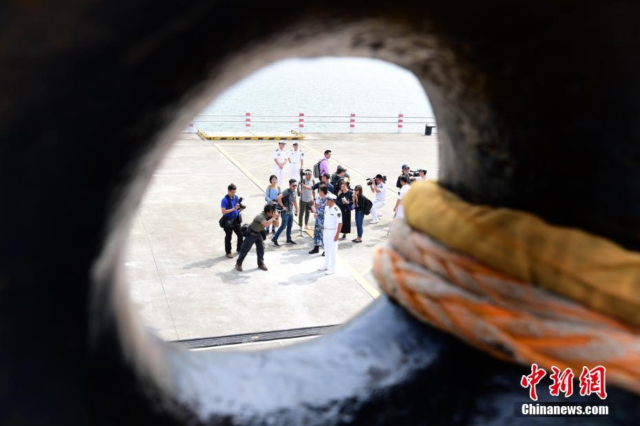 10月24日,中国-东盟“海上联演-2018”参演的各国舰艇在湛江某军港组织开放参观活动。图为媒体记者采访中国海军广州舰舰长。中新社记者 陈文 摄