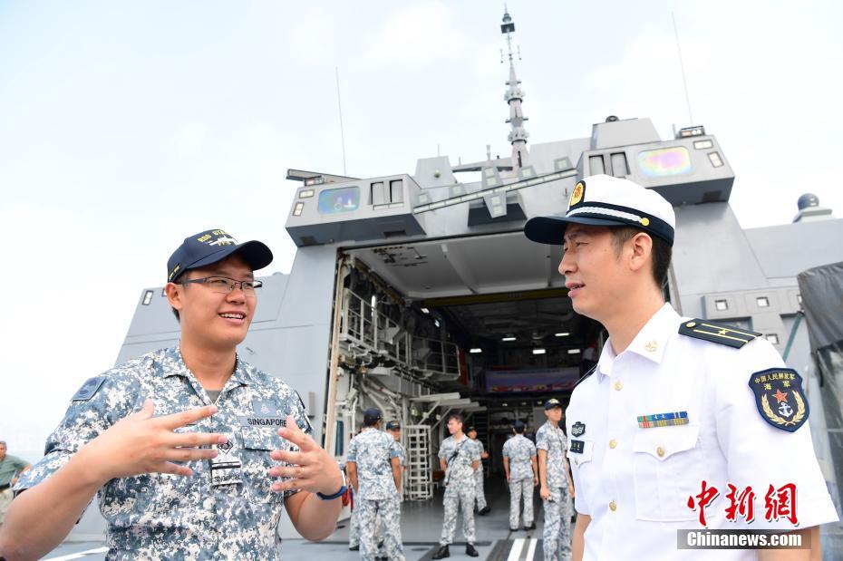 图为中国海军官兵与新加坡海军“忠诚”号护卫舰官兵交流。中新社记者 陈文 摄