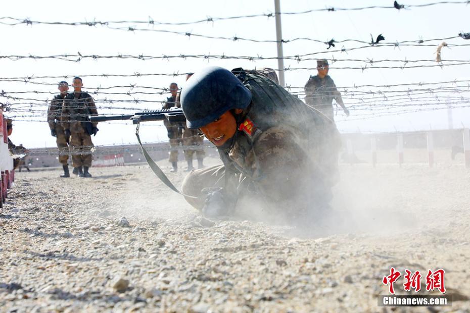 10月23日,新疆军区某训练基地训练场上尘土飞扬,新兵连组织全体新兵在沙地上开展战术基础动作训练。训练场上,全体新战士个个都是嗷嗷直叫的“老虎”。图为新战士黄峰科在训练中血性十足。张亮亮 摄