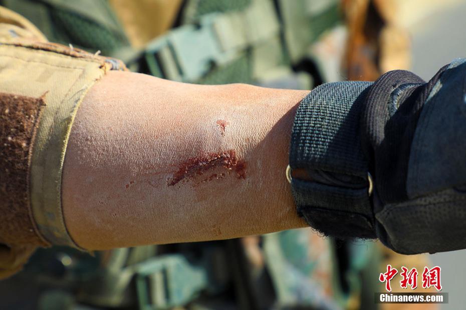 10月23日,新疆军区某训练基地训练场上尘土飞扬,新兵连组织全体新兵在沙地上开展战术基础动作训练。训练场上,全体新战士个个都是嗷嗷直叫的“老虎”。图为新兵在训练过程中手臂受伤。罗兴仓 摄