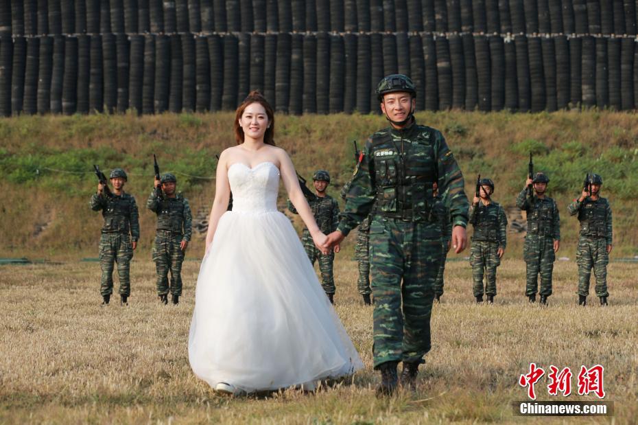 近日,武警山东总队烟台支队机动中队中队长与妻子在军营里拍摄了一组特殊的军旅婚纱照。此次拍摄从策划到摄像都得到了战友们支持,也凝聚了战友对新人美好的祝愿。