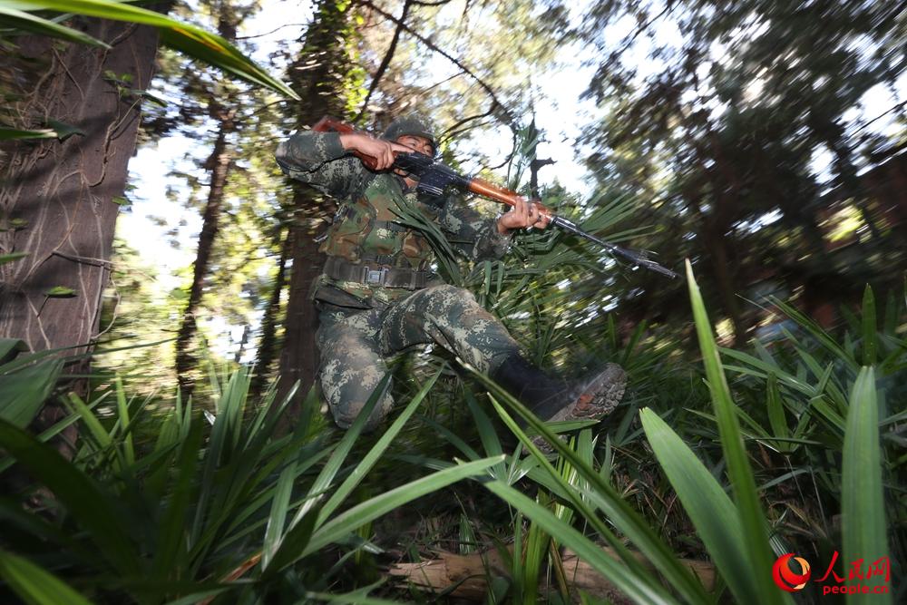 分队进行捕歼战斗演练,狙击手在山林地进行快速突击。胡程摄