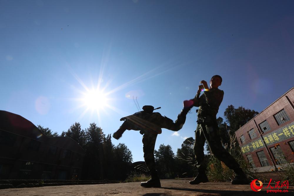 分队进行捕歼战斗演练,官兵与“暴恐分子”进行搏斗。胡程摄