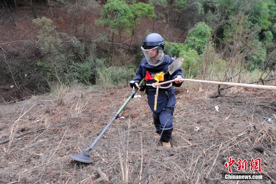 自新一轮扫雷行动启动以来,截止10月25日,该边防旅累计出动扫雷官兵24000余人次,转战8个边境县(市、区)17个乡镇,搜排出地雷等爆炸物2300多枚,为边疆人民恢复和新增生产用地、经济林用地2300余亩。图为搜排手紧握安全绳进行搜排。 蒋雪林 摄
