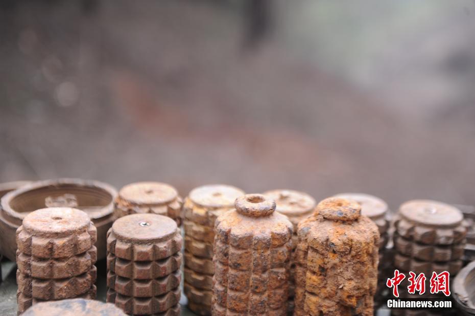 中越边境此轮扫雷行动自2017年11月正式启动以来,该边防旅已对中越边境广西段40处、158万多平方米深排雷场进行搜排。截至当日,广西边境深排雷场扫雷任务已全部完成。图为扫雷队展示搜排出的地雷。蒋雪林 摄