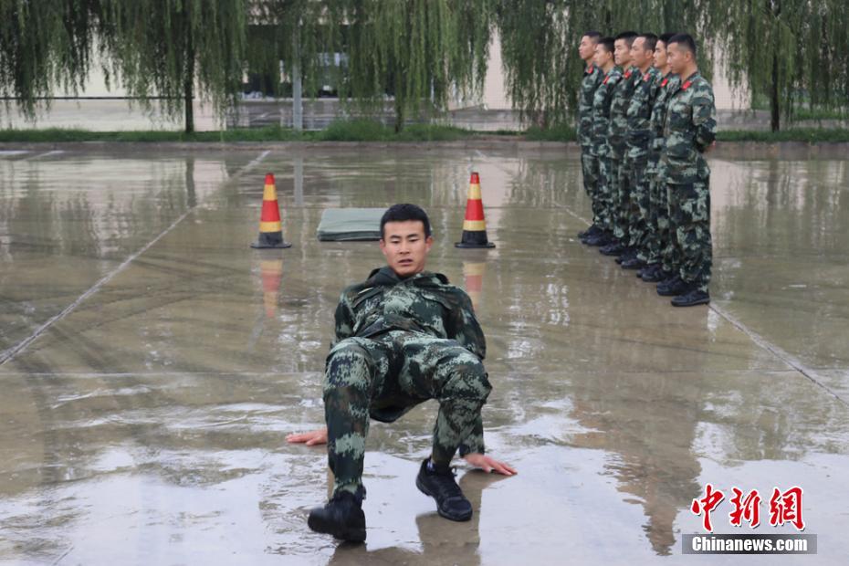 兰州营区武警官兵秋日练兵 单手举杠铃比拼真功夫