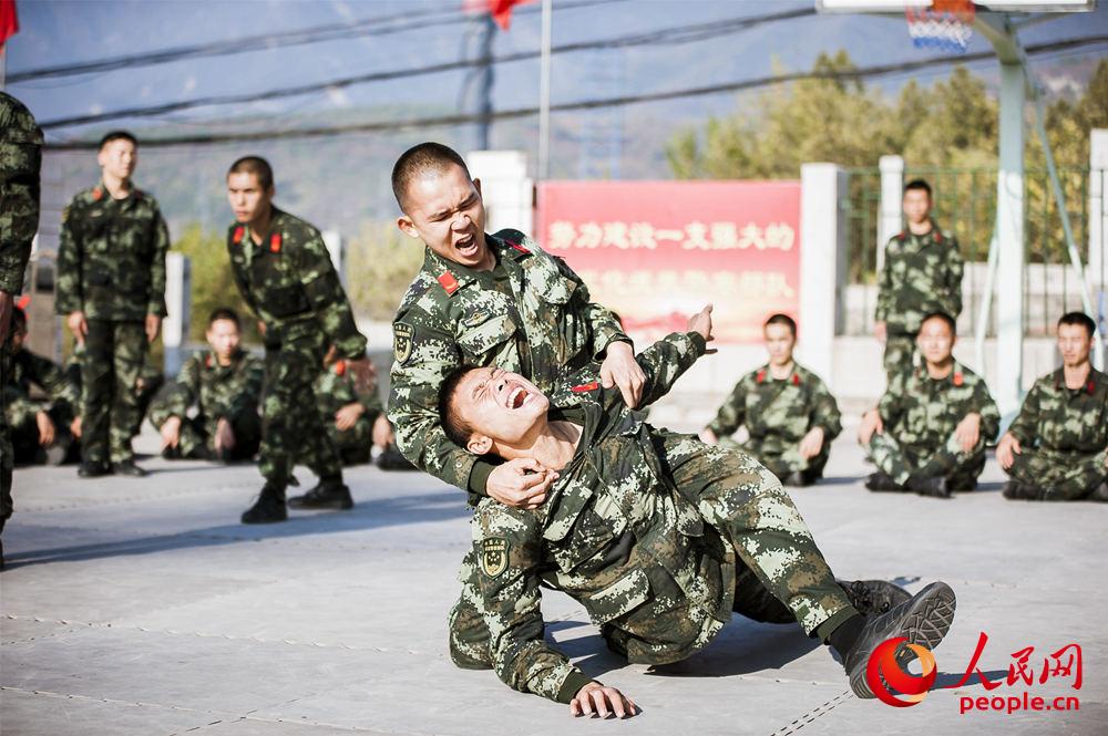 兰州营区武警官兵秋日练兵 单手举杠铃比拼真功夫
