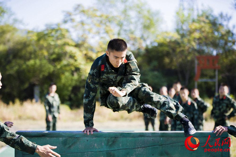400米障碍综合训练中,一名战士快速越过低板墙。强健摄