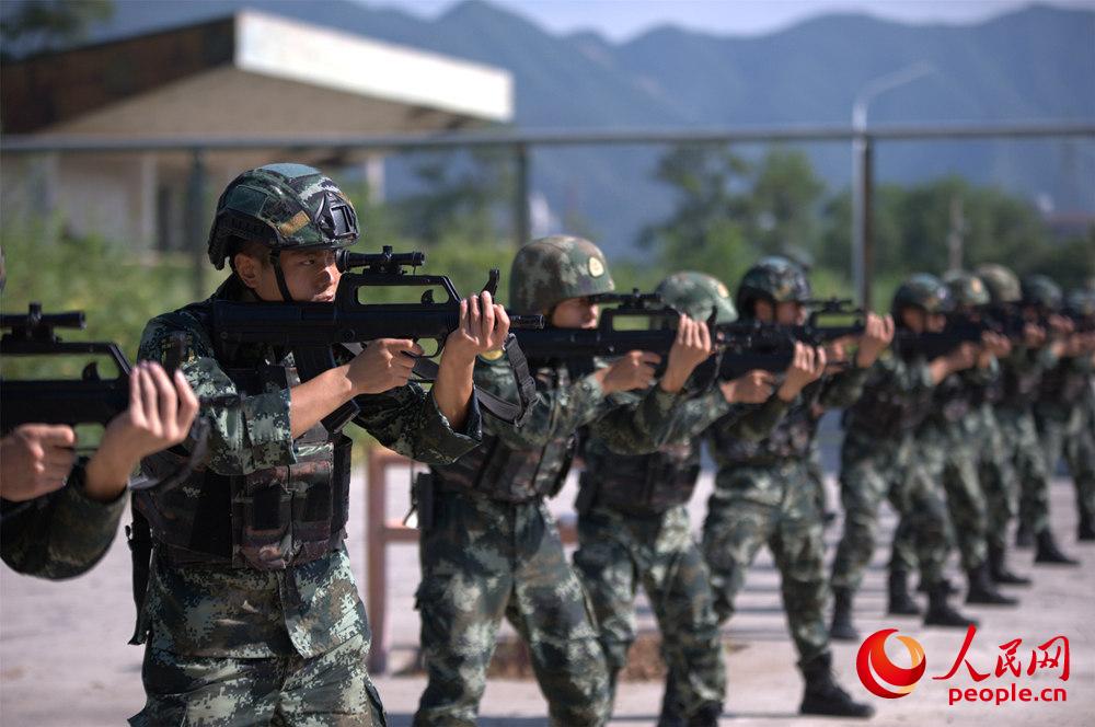 兰州营区武警官兵秋日练兵 单手举杠铃比拼真功夫