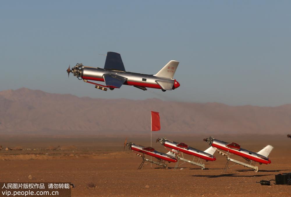 10月27日,西北戈壁,第75集团军某旅组织的模拟演练过程中一架模拟的敌靶机起飞。