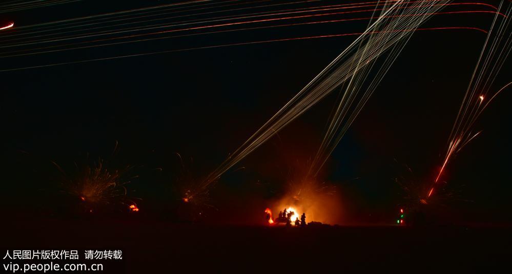 10月25日,西北戈壁,第75集团军某旅组织某型高炮夜间实弹发射时的场景。