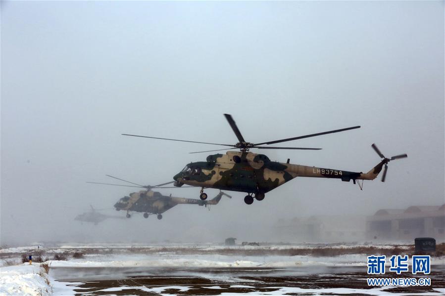 2018年1月5日,新疆军区某陆航旅运输直升机一营在严寒条件下组织飞行训练。 新华社发(吴世科 摄)