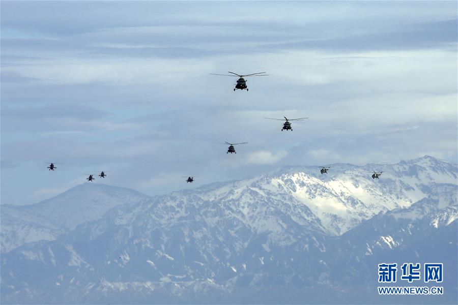 2018年5月25日,新疆军区某陆航旅运输直升机一营在高海拔地区开展协同训练。 新华社发(吴世科 摄)