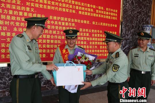 图为武警崇左支队向黎伟基赠送纪念品。 杨瑞 摄