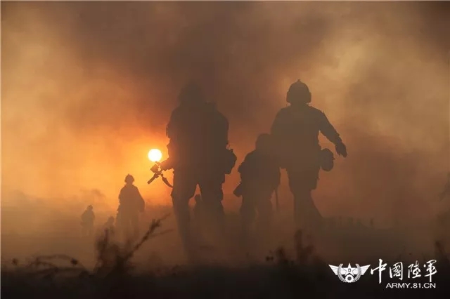 ▲ 日暮沙场、硝烟弥漫,参加“跨越-2017·朱日和”演习的官兵勇往直前。“脖子以下”改革展开后,陆军组织系列基地化训练,深入探索体系重塑、力量重构、功能重组后战法训法。(仇成梁 摄)