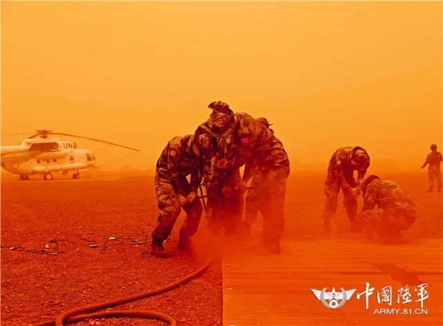 ▲ 中国赴马里维和工兵分队在风沙中修建加奥机场防御设施。驻马团东站区最高行政长官哈提姆赞誉“中国工兵不愧为驻马团典范”。(赵佳明 摄)