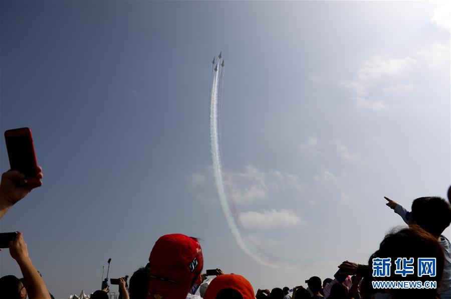 11月11日,观众在观看中国空军八一飞行表演队进行的飞行表演。 当日,第十二届中国国际航空航天博览会在广东珠海闭幕。 新华社记者 刘芳 摄