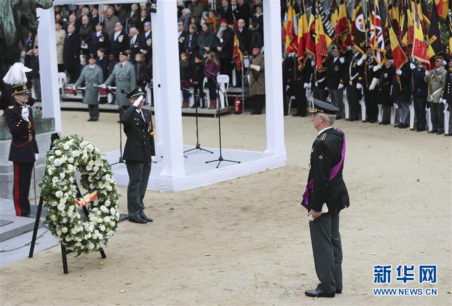 11月11日,在比利时首都布鲁塞尔无名战士广场,比利时国王菲利普向无名战士墓敬礼。 比利时国王菲利普11日在布鲁塞尔无名战士墓前参加第一次世界大战结束一百周年纪念活动时,呼吁人们共同建设世界和平。 新华社记者 叶平凡 摄