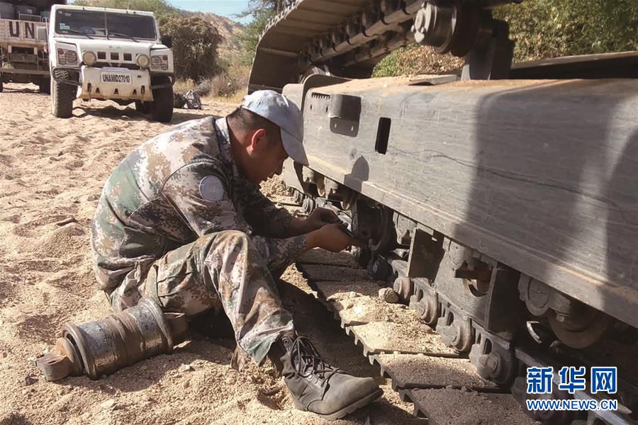 11月12日,在苏丹达尔富尔,中国第14批赴苏丹达尔富尔维和工兵分队更换磨损配件。