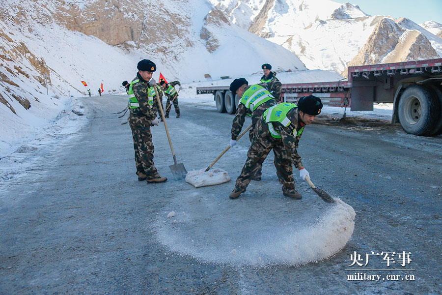 新藏线结冰致交通受阻 武警官兵鏖战6小时抢通道路