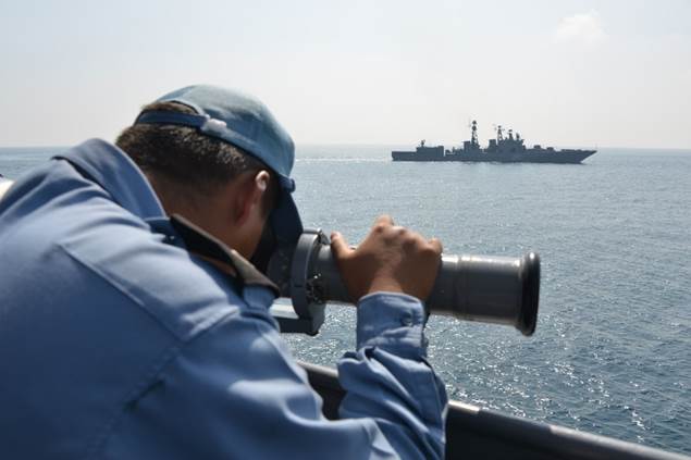 日本海上自卫队的DD-109“电”号驱逐舰和俄罗斯海军的北莫尔斯克号护卫舰进行联合演练,俄罗斯的卡-27舰载直升机在电号驱逐舰上降落。