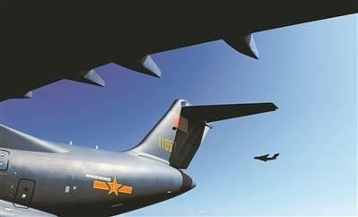 11月6日,地面静态展示与空中飞行表演的运-20大型运输机交相辉映。